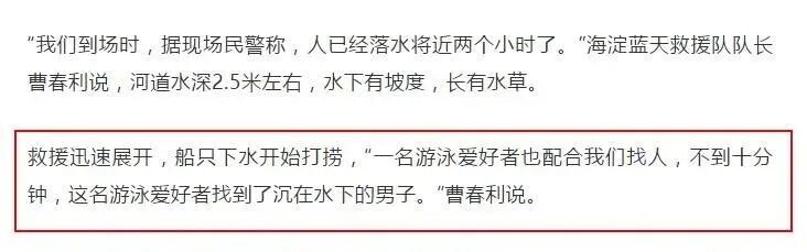 十分钟左右,在靠近河岸的斜坡下方,水深2.5米的河底位置,田思维找到了遇难者。他把绳子捆在了遇难者的左胳膊上,在岸上民警及救援队的通力配合下,将遗体拉到了岸边。随后便匆匆离开现场,并未留下真实姓名。