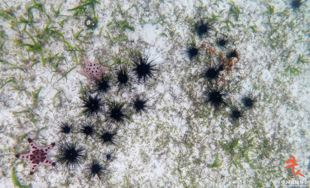 海划途中,他还经过了一片约四五十公分深度的浅滩。往下一看,水下黑压压的,全是浑身冒着尖刺的海胆。