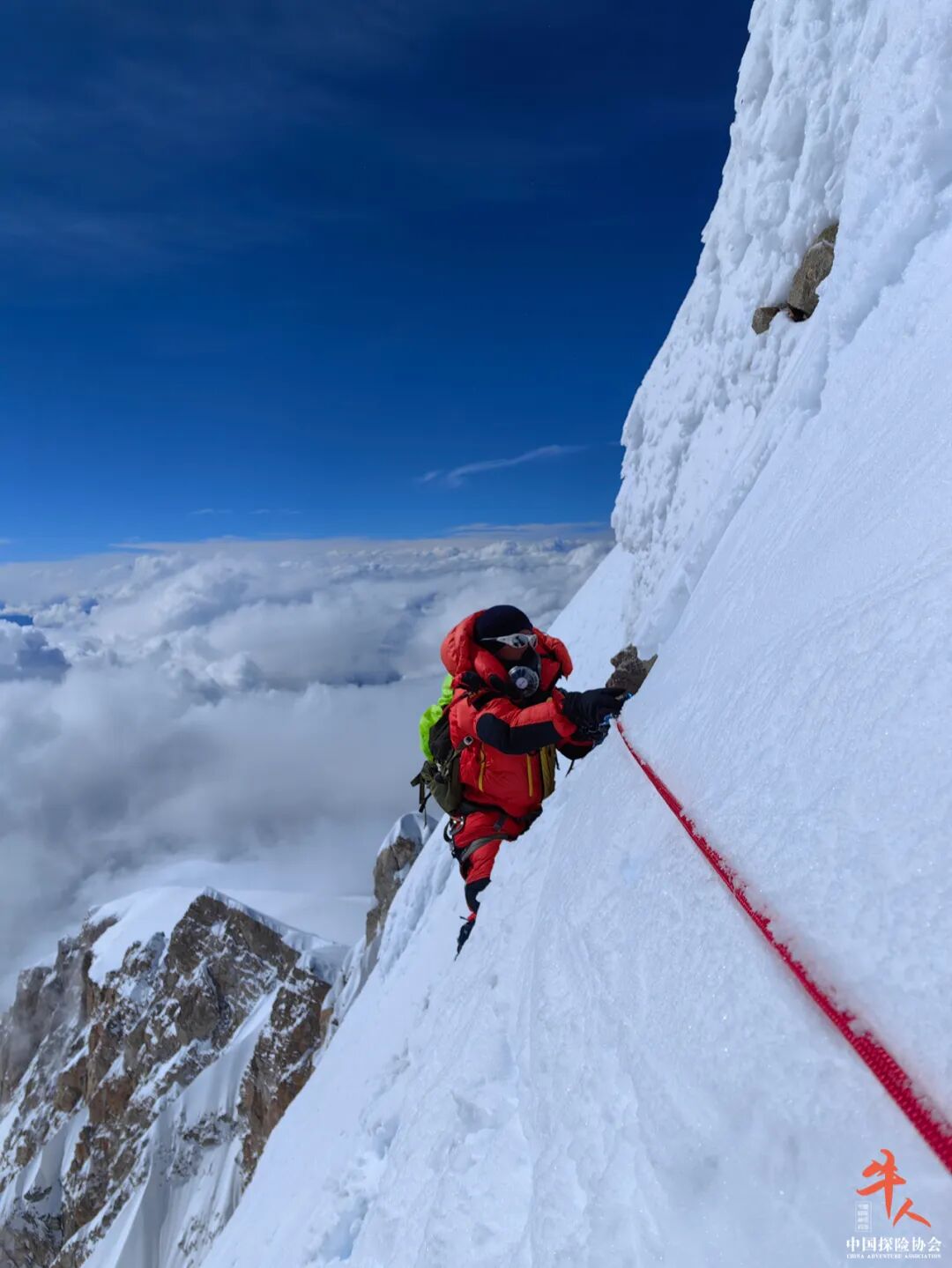 “我们只能沿着登顶返回来的U型槽这个路绳,先尝试着爬下去,之后在近乎80°的雪坡上,用冰爪先踢出人能够站在上面的空间。然后,将安全锁挂在这一段仅有的一个岩钉上固定,横切到真顶。”