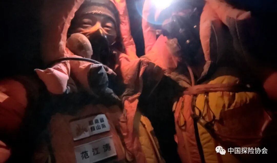 身为湖南登山队领队的范江涛,与夏尔巴行至珠峰8450米处。