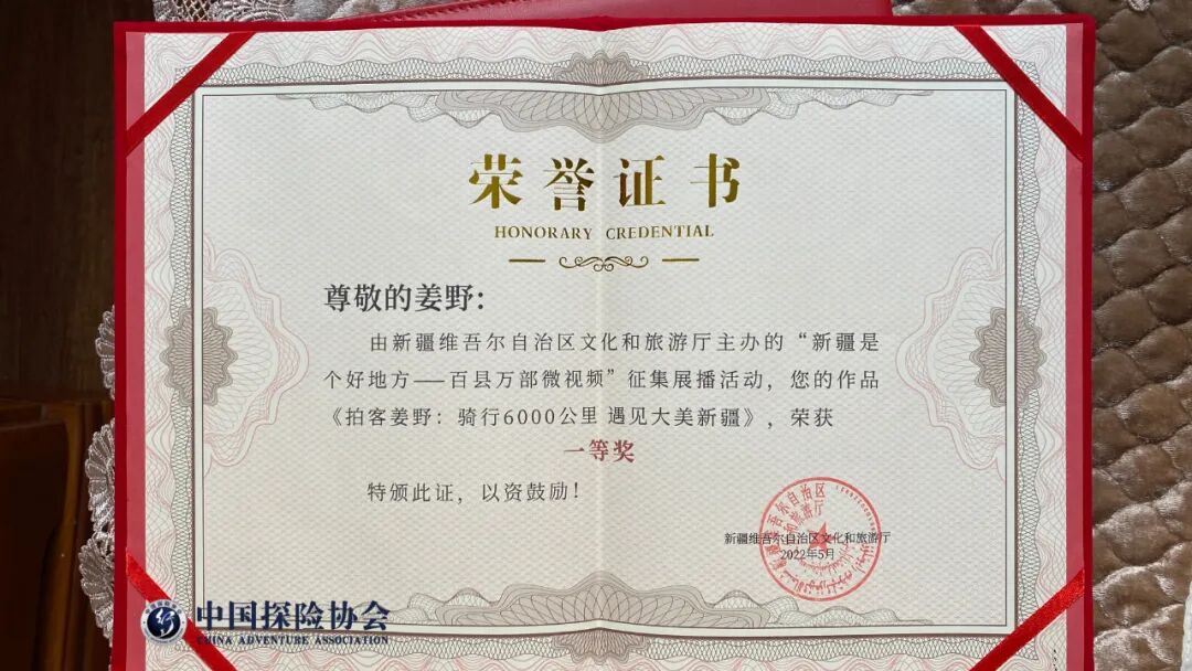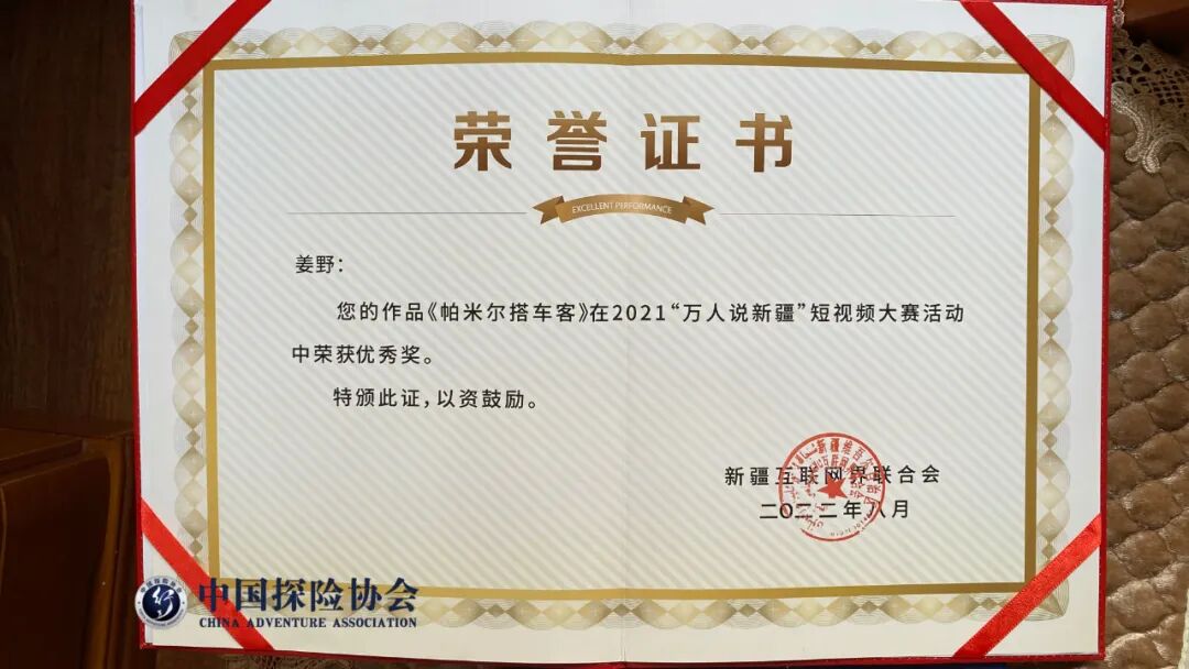 2022年8月,姜野作品《帕米尔搭车客》在“万人说新疆”短视频大赛活动中获新疆互联网界联合会颁发的优秀奖。