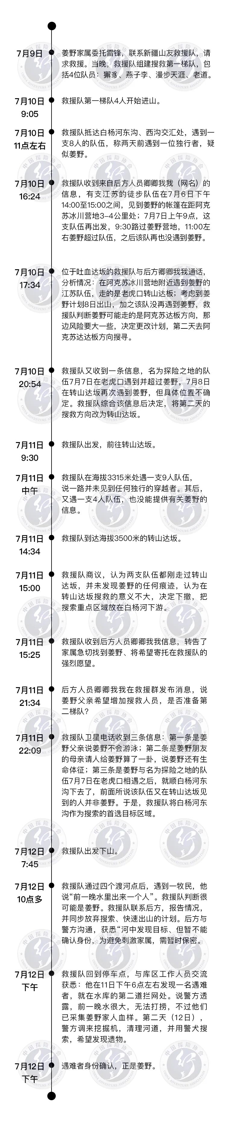 在对姜野展开搜救的过程中发现,自7月5日与老王分别后,姜野7月6日、7月7日先后遇到过两支徒步队伍,一支来自江苏,另一支名为探险之地。