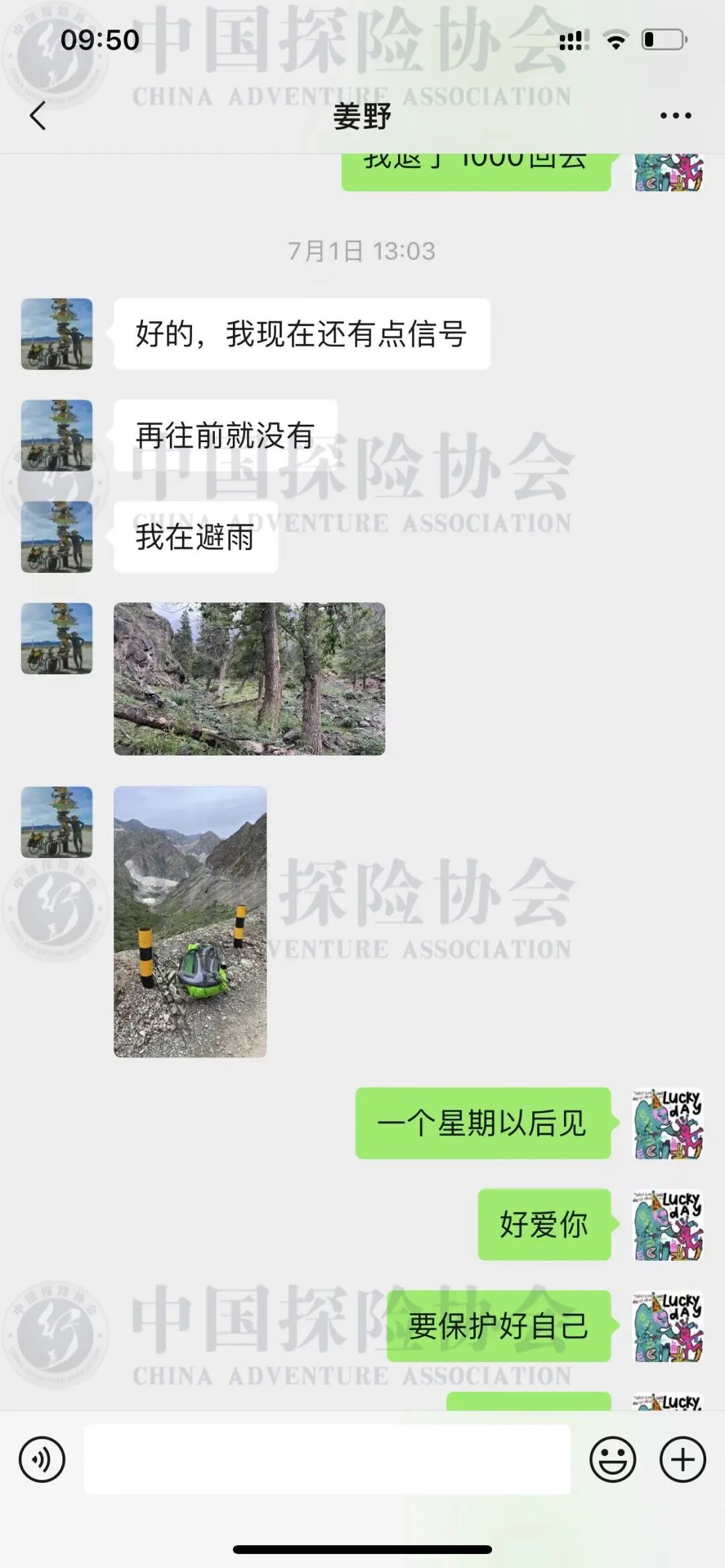 7月1日中午13:03,已进山的姜野回复女友消息,说自己在避雨,目前手机仍有点信号,再往前就没了。