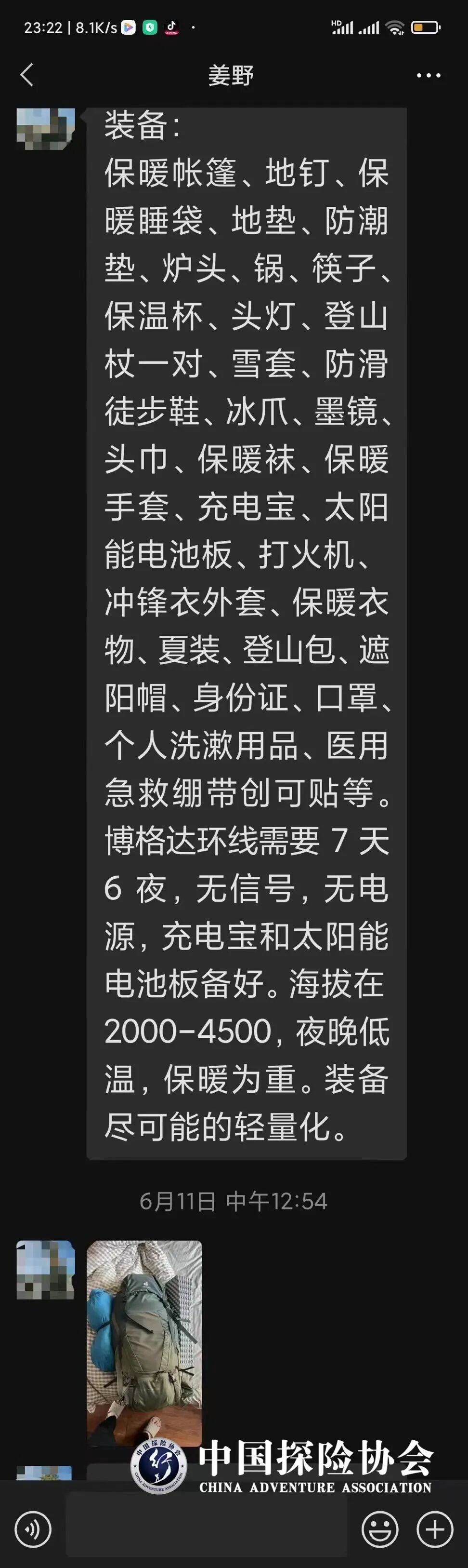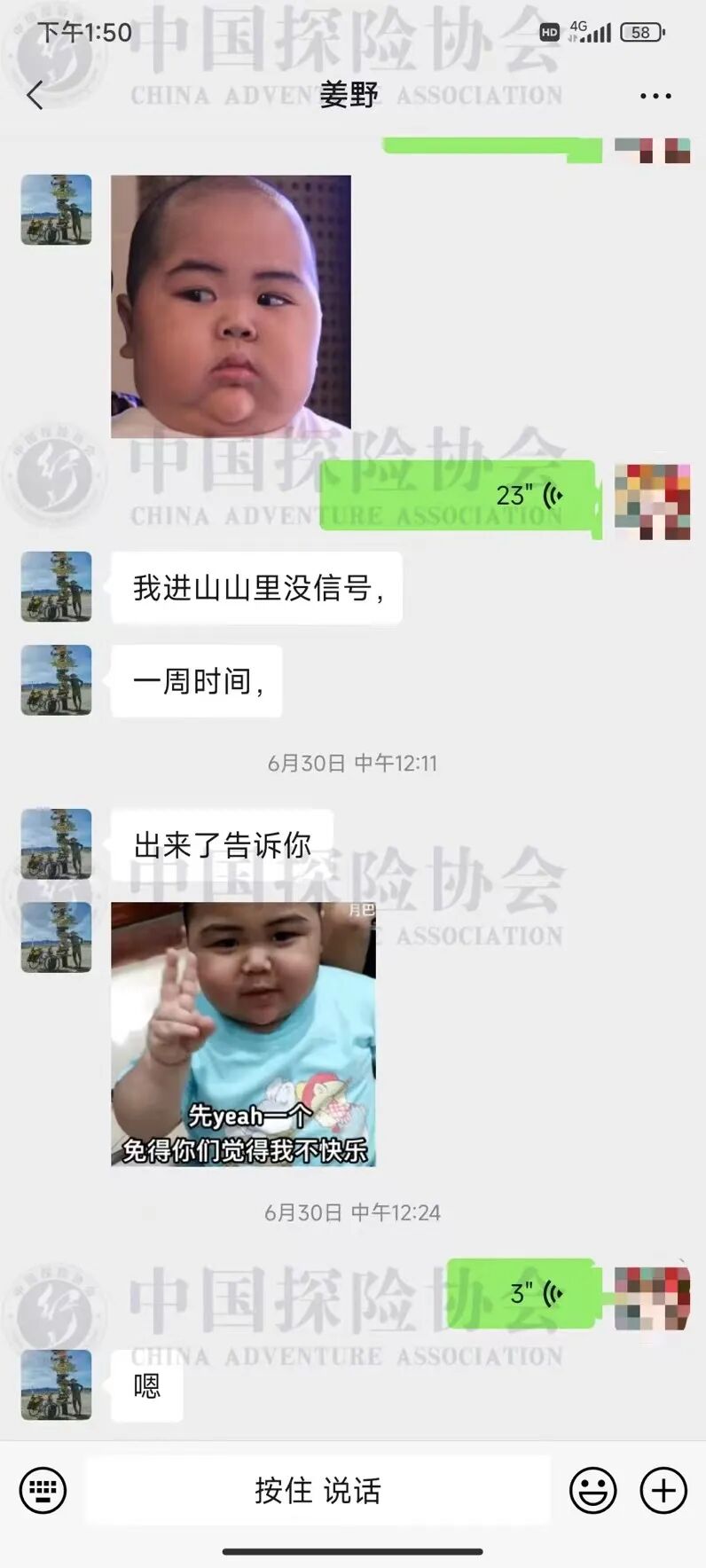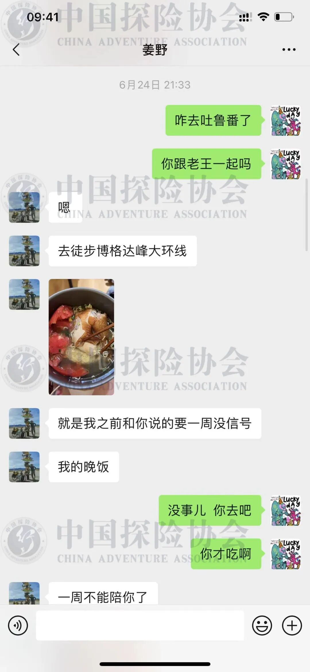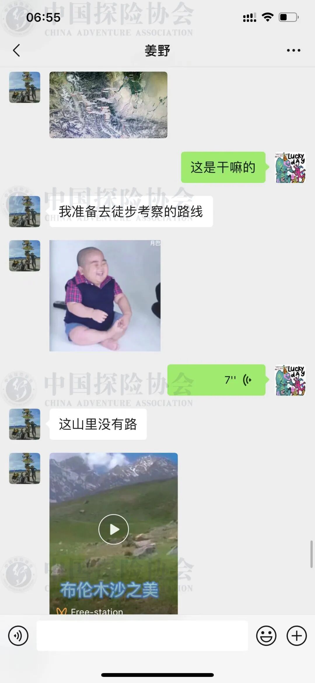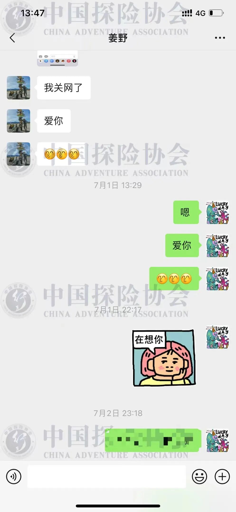 本文中姜野与母亲、女友项项、朋友老王的对话截屏,系上述权利人独家授权中国探险协会使用。未经书面授权,禁止任何方式转载、引用。