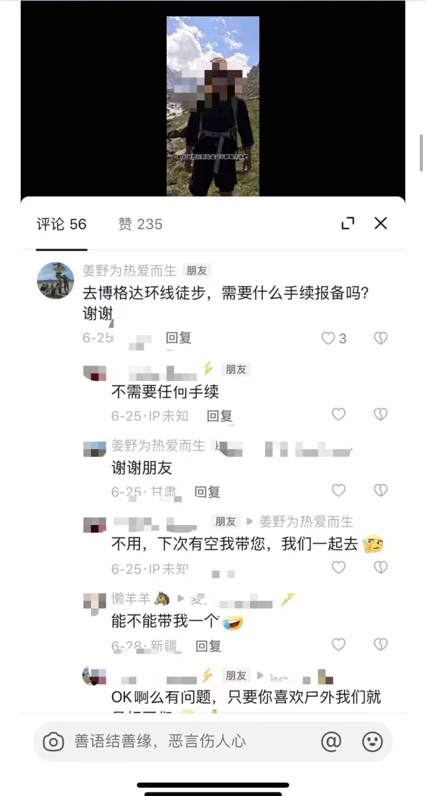 6月25日,姜野在社交媒体上询问一位徒步过博格达大环线的网友,在进山之前,是否需要报备?对方回复,说“不需要任何手续”。