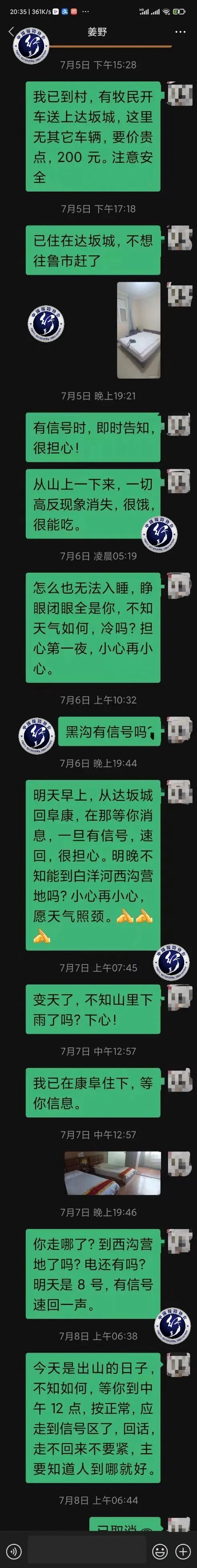 7月5日“分手”时,姜野让老王在下山途中随时给他发微信,一旦有了信号,他就能立刻看到,好放心。老王也遵嘱,把自己下山后的情况微信告知。