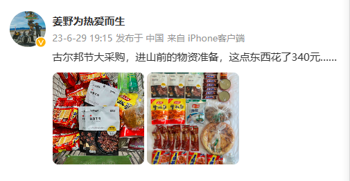 6月29日19:15,姜野更新了微博——这是他今生最后一条微博。当天,恰好赶上维吾尔族的重要传统节日——古尔邦节,他花了340元采购徒步博格达所需的食物补给。在发微博之前,他还在微信上向女友抱怨,说买的食物“太贵了”。