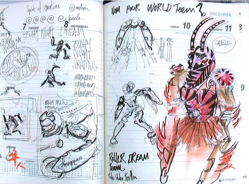 于是,布朗杜开始疯狂画草图,用手绘来设想如何让全身装满轮子、这套装备将具备什么能力?以及能力背后的技术实现。