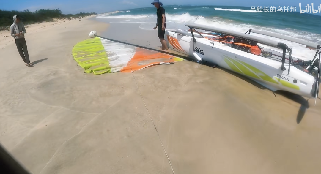 幸运的是,在两位陌生钓鱼人的帮助下,吕伟锋紧急靠岸成功。不幸的是,船的侧支索断裂,导致整个桅杆倒下。
