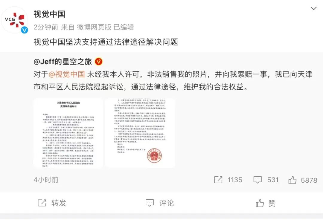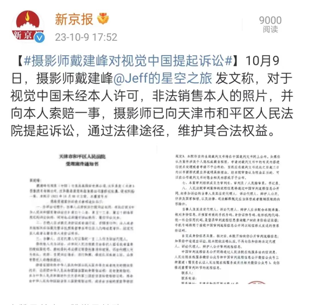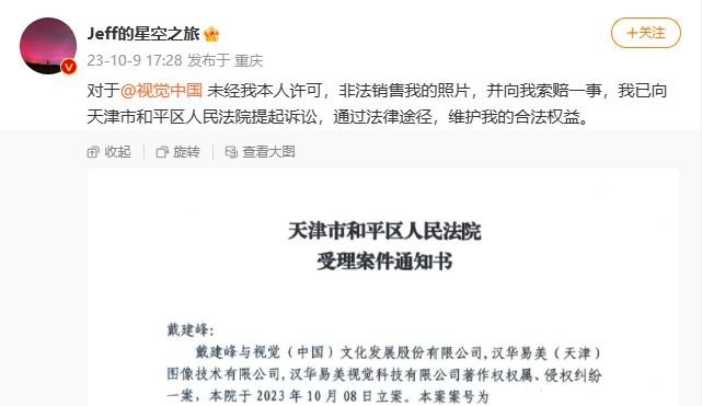 2023年10月9日下午,中国探险协会会员、签约摄影师、知名星空摄影师戴建峰(网名:Jeff的星空之旅)在其自媒体宣布,已就作品遭视觉中国侵权一事,向天津市和平区人民法院提起诉讼,法院已立案受理。