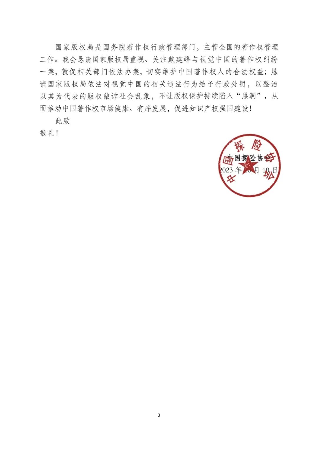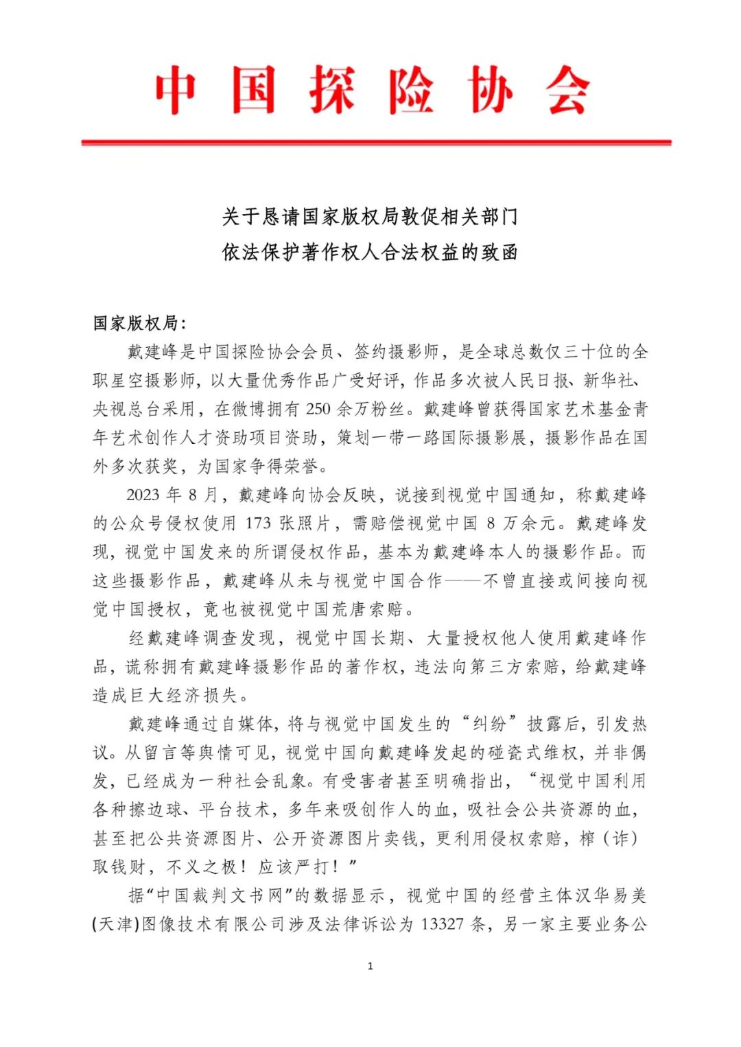 国家版权局是国务院著作权行政管理部门,主管全国的著作权管理工作。我会恳请国家版权局重视、关注戴建峰与视觉中国的著作权纠纷一案,敦促相关部门依法办案,切实维护中国著作权人的合法权益;恳请国家版权局依法对视觉中国的相关违法行为给予行政处罚,以整治以其为代表的版权敲诈社会乱象,不让版权保护持续陷入“黑洞”,从而推动中国著作权市场健康、有序发展,促进知识产权强国建设!