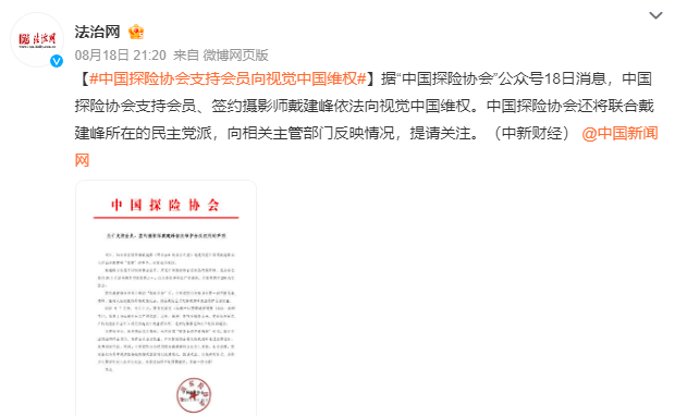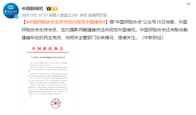 作为中国探险协会会员,戴建峰向协会反映上述情况去,希望协会支持其依法维权。在核实相关情况后,中国探险协会公开发布《关于支持会员、签约摄影师戴建峰依法维护合法权利的声明》,坚决支持戴建峰依法维护合法权益。