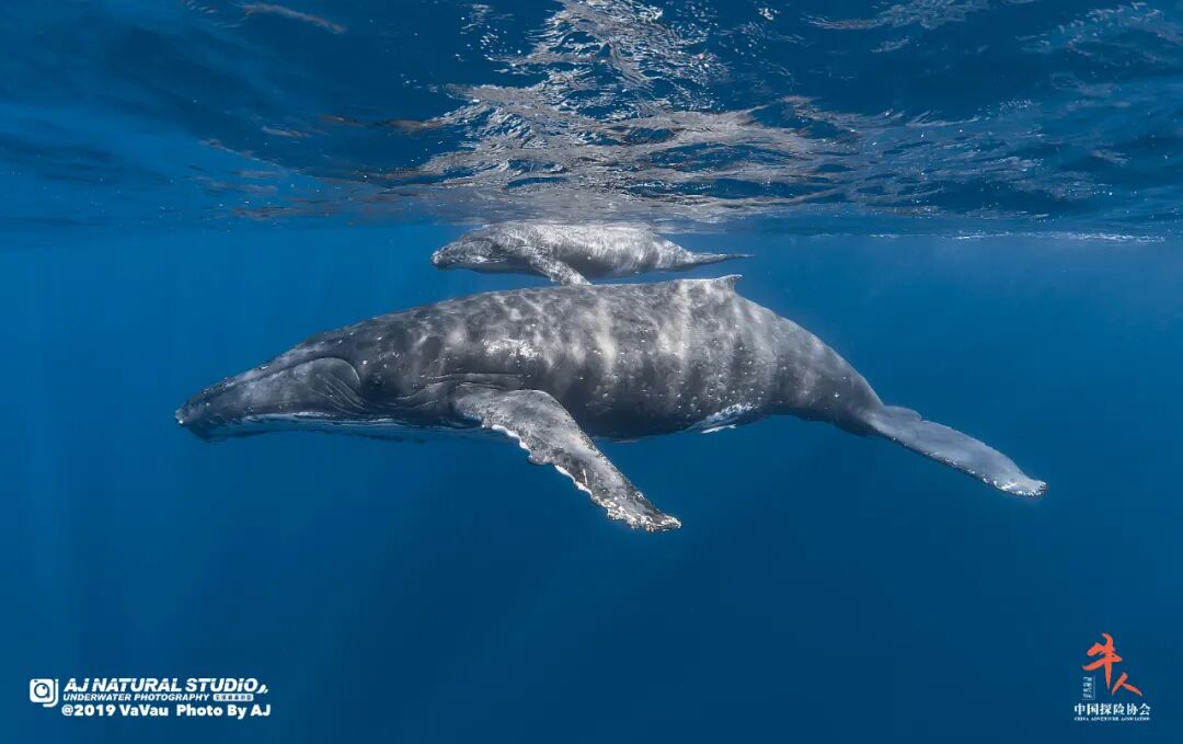 2018年9月的一天,在汤加的某处观鲸海域,一对座头鲸母子正悠然地享受独属于它们的亲子时光。