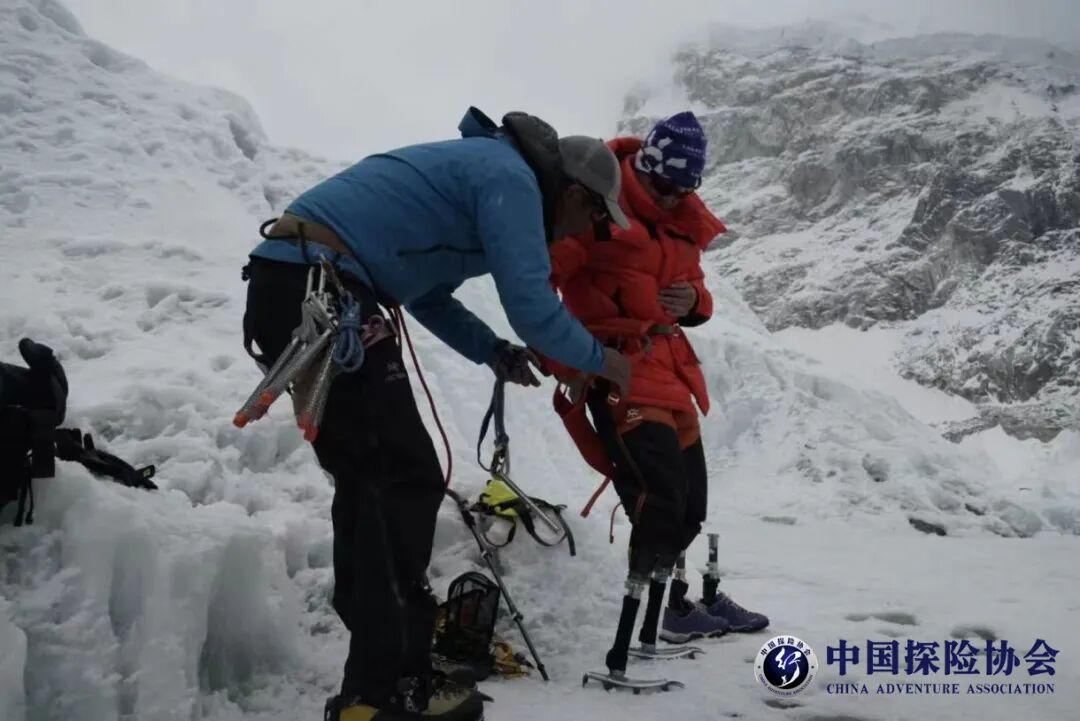 “在登顶后下撤,我双目失明的情况下,向导达瓦G冷静应对。他没有抛弃我,而是一个绳节、一个绳节地引导我下山,中间还使用了绳索下降技术,让我安全回到营地。”