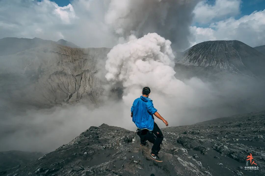 更危险的是,他在火山堆上走着走着,不小心“踩空”,整个人直接掉下去——也包括摄影包、三脚架等。