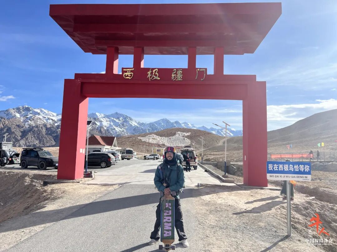 12年来,他滑板徒步近1.5万公里,位于中国大陆最西端的新疆乌恰县吉根乡斯姆哈纳村成为他打卡的第三个极点。