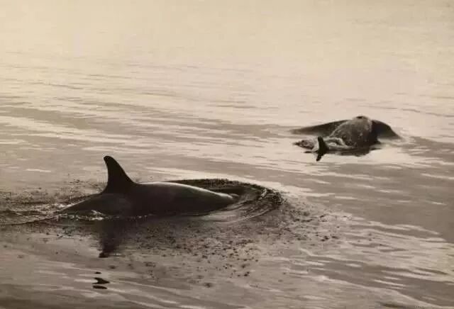 两头虎鲸浮出水面透气。
