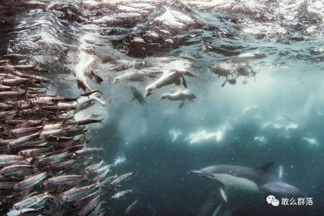 海豚、鲣鸟、海狮、布氏鲸、虎鲨、黑鳍鲨、大白鲨等等捕猎者早有准备。密密麻麻的沙丁鱼被成群的海豚包围、巨大的座头鲸在身下翻滚、大群的鲣鸟从空中像炮弹般射入水中捕食沙丁鱼,拉着一长串气泡尾迹,壮观而惨烈。