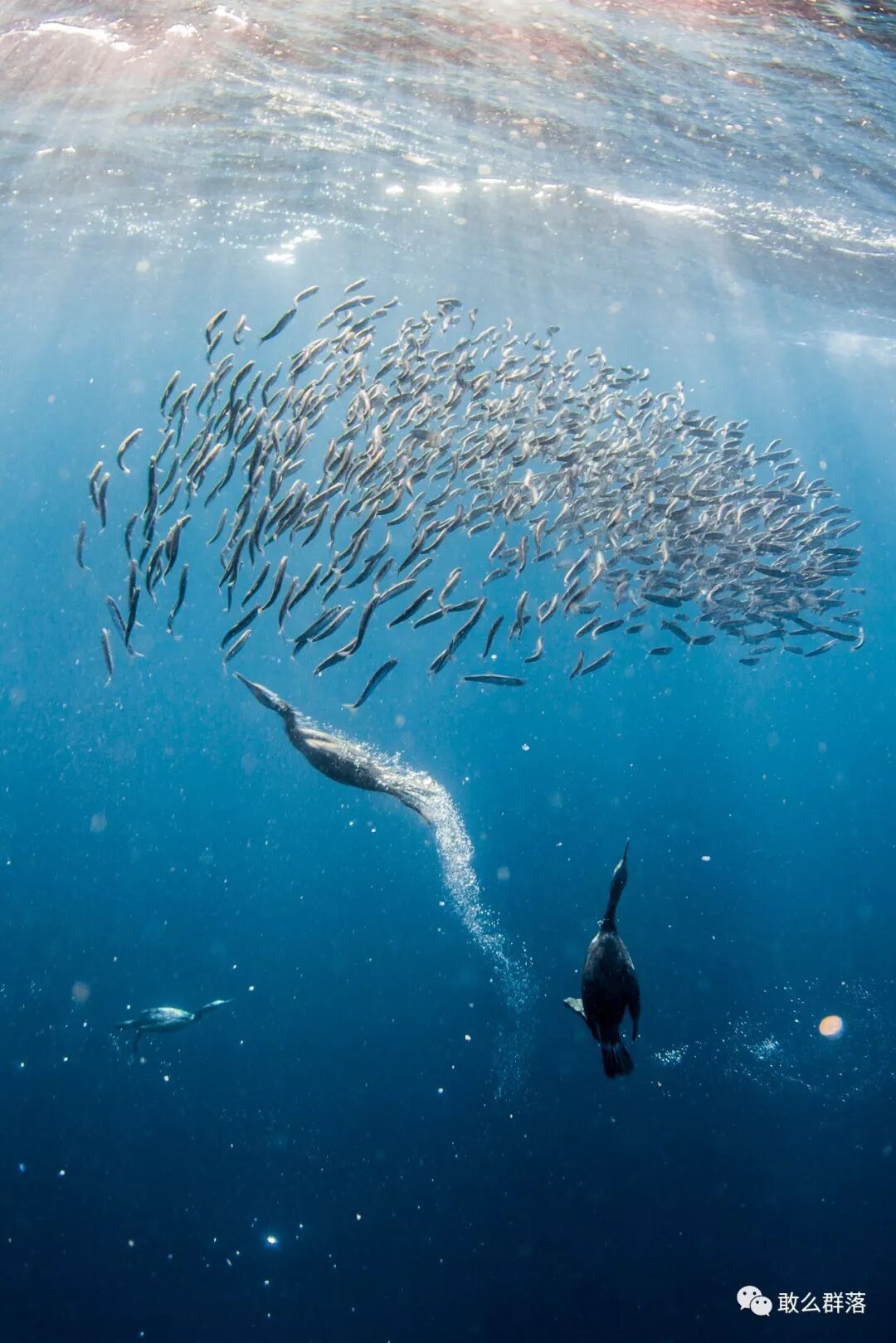 2:沙丁鱼是一个我一直六年以来每年都会去南非去拍摄沙丁鱼大迁徙,因为最早我了解这个题材也是通过一些像BBC,美国国家地理这种纪录片,他们都会以非常大的篇幅来介绍这个,这是一个自然界一个很大的事件,就像大家都知道非洲角马大迁徙一样,大概在同样也是六七月份在非洲的最南端南非的厄加勒死角这一块有一个浅滩,这个沙丁鱼会从这儿出发迁徙超过一千多公里,其实一点都不比陆地迁徙差,它们也是非常壮观,因为这些捕食者像海豚,大量的海豚,上千只的海豚有时候你能看见,然后还有鲸鱼,然后这种成千上万的鲣鸟在天上盘旋,然后各种鲨鱼几十条上百条在围猎这个鱼球,都是非常震撼,非常壮观的。就是,所以我一直来就是每年都会去这个地方拍摄这个。
