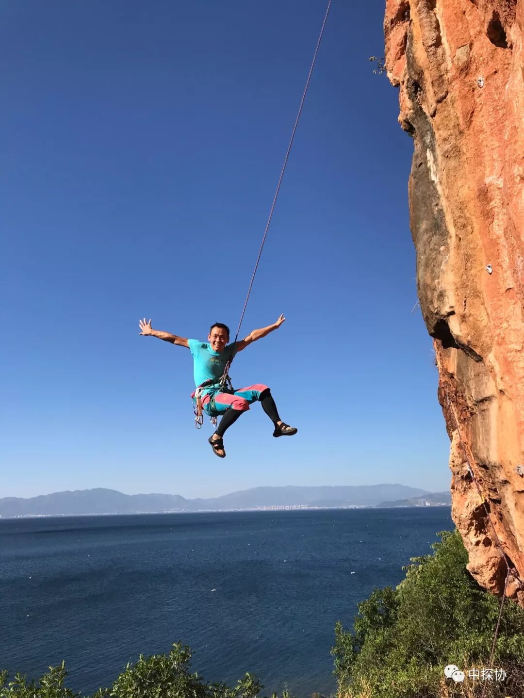 就在前天的此时此刻,在那一刻当下我和我的儿子还有两个年轻人,他们20岁左右,我们4个人就在昆明滇池边上的西山做攀岩,这是自然的岩壁,石灰岩喀斯特地貌,阳光照的那边红红黄黄的,爬到上面去的时候,我和我自己的孩子就在大自然的这种岩壁之上,我们回过头看,昆明的市区高楼林立,然后西伯利亚的红嘴鸥在沧海在滇池的上面飞着,在那样的情境底下,在那样的湖面上,在山里面的树林上,在悬崖上,无论是老人还是我自己还是孩子,我们之间会有一个很好的一个感受和感觉,这就是眼前的这种事情。