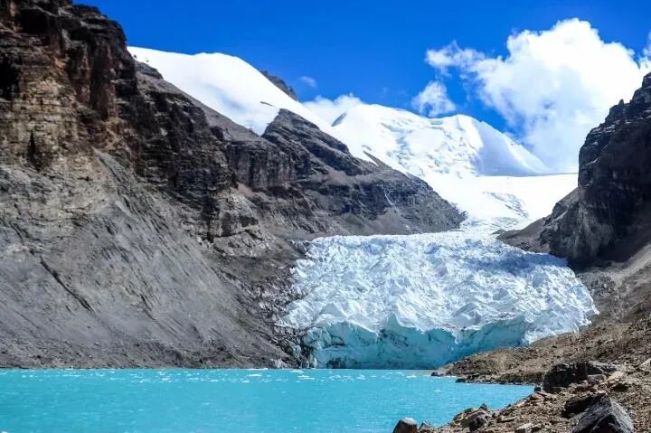 环曲登尼玛湖边的石块走到湖岸的对面,便可抵达曲登尼玛冰川。曲登尼玛冰川体量并不大,但它是为数不多的可以近距离观看的冰川,只要体力好,可以一直徒步到冰川跟前,与冰川零距离接触!