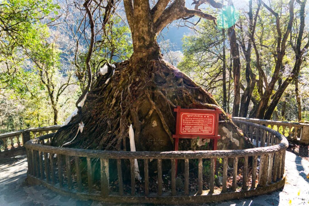 短暂游玩过后进入今日最后一个大景区——森木扎(魔女谷)景区。“森木扎”,又名“魔女谷”,属“勒布四谷”之一。看了下路牌简介,大家仿佛有些泄气,毕竟这又是一段徒步拉练的山谷景区,但星哥说:山顶有条瀑布,据说有缘者能在瀑布层中看到酥油灯。大家就冲着这条神秘的瀑布,开始一鼓作气地沿着石阶往山顶上爬,途中参天古树、小松鼠、藏猕猴多少为这条拉练线路增添了几分乐趣。在斑驳的树影中大家一路奔到了山顶,傻眼了,什么瀑布啊~~连条水渠都没瞅见。星哥也很无奈地说:可能是季节性河流吧,冬天枯水期瀑布没有了,夏天来还在的……