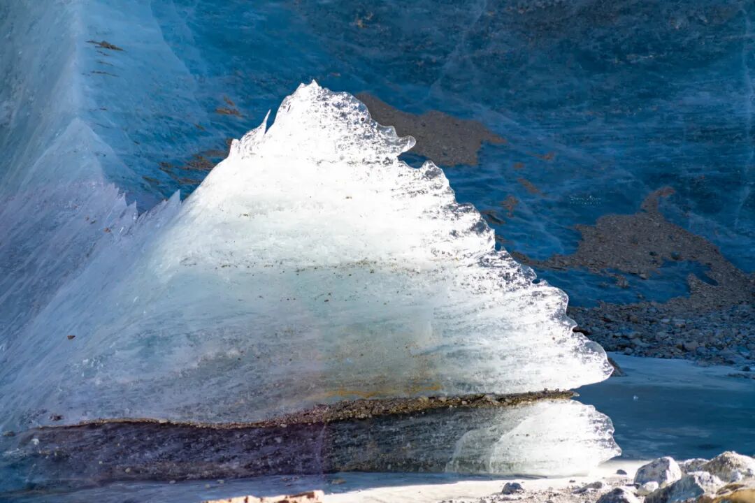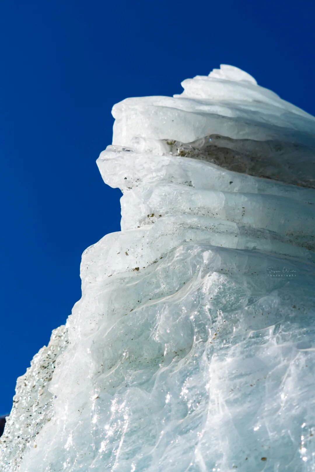 这个圣湖无论从面积还是深度都远超于龙巴西措,不知什么原因湖中时不时会传来巨大而沉闷的冰爆声,是那种很闷的轰隆声,配合着当时深蓝的环境基调,深海恐惧症突然来袭,使得我感觉有些压抑甚至有些想返回的冲动。湖岸的冰川像瀑布一样堆叠在岸边,拉近镜头才发现冰川真正的样貌,这里的冰川密集而宽广,没有龙巴西措冰塔林的高耸分散。如果早点来到这里想必景色也是震撼至极吧。