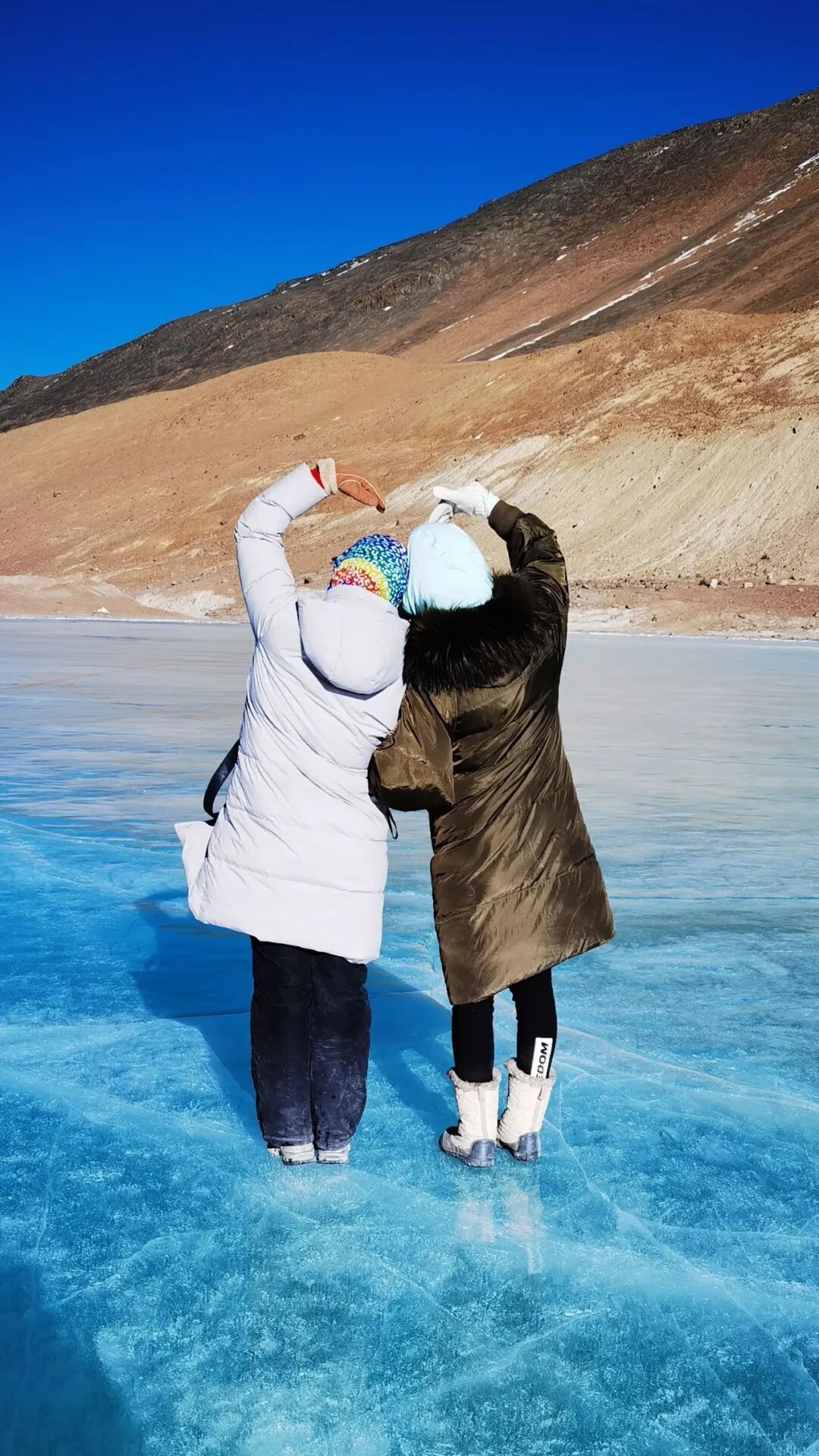 登记完毕,警察特别交代不得放无人机,所以就言听计从地收起了无人机。因为这种边境雪山冰川属于小众行程,来此游玩的客人并不多,进入冰川的整条路几乎都为搓板路。嘬宝宝气定神闲开始表演,开足马力飞驰在搓板路上,伴随着车尾扬起的滚滚尘烟,此时此刻竟有了些荒滩越野的意味。10多分钟后车子便到达了龙巴西措的岸边,远处几名游人从冰面一路滑行归来,极大地说明了冰面的情况,星哥打头阵带着我们几个队员开始从冰面向冰塔林进发。