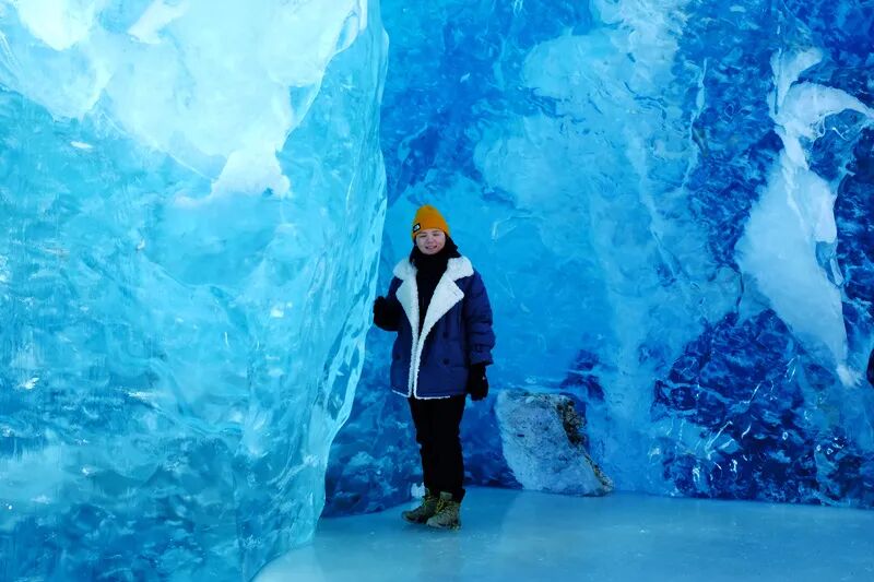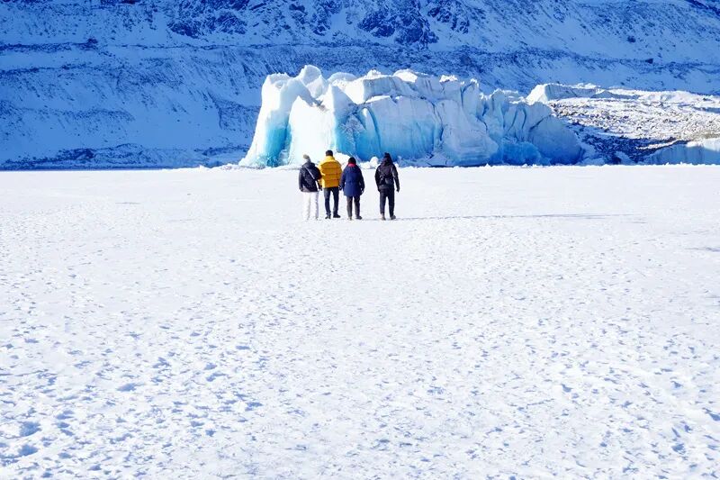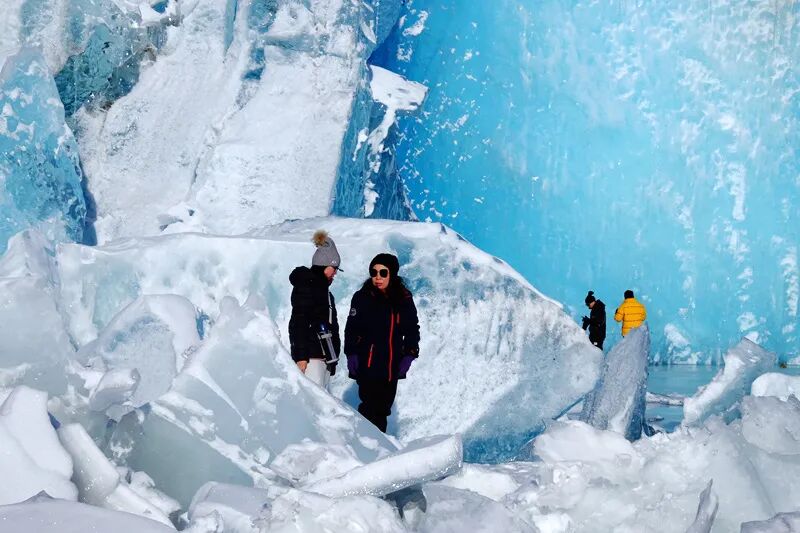 美女们见到如此美丽的冰川也兴奋的跳跃起来