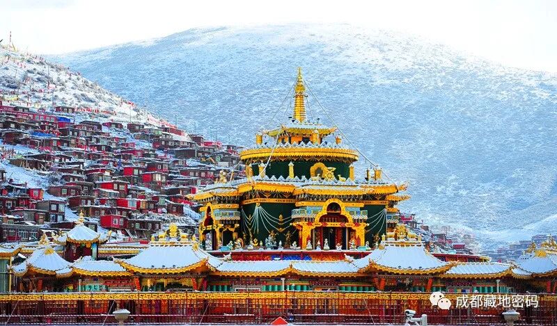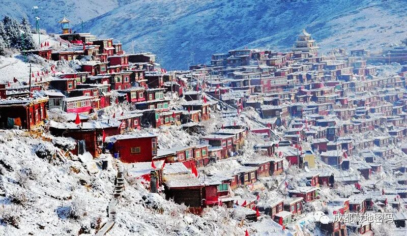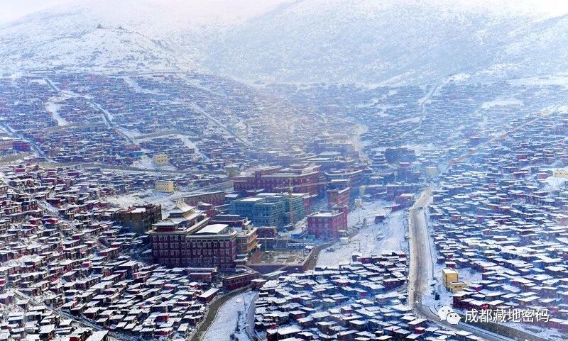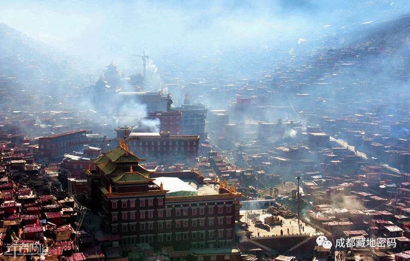 在重重的群山环绕之中,沟里的僧舍,以佛学院大经堂为中心,密密麻麻搭满了四面的山坡。