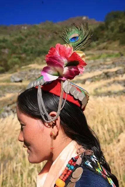 夏尔巴人妇女的服饰很有特点,她们头顶的帽子上以鲜花和孔雀羽毛点缀,脖子上挂着由两百多个银环连成的项链,胸前挂着六个银制的小串子,腰部系着银带,手腕戴着大白贝壳,透露出一种原始古朴。