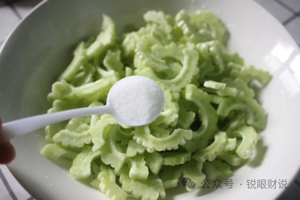 食用盐不仅能够提升苦瓜的口感,更有助于将苦瓜内部的苦水腌制出来。