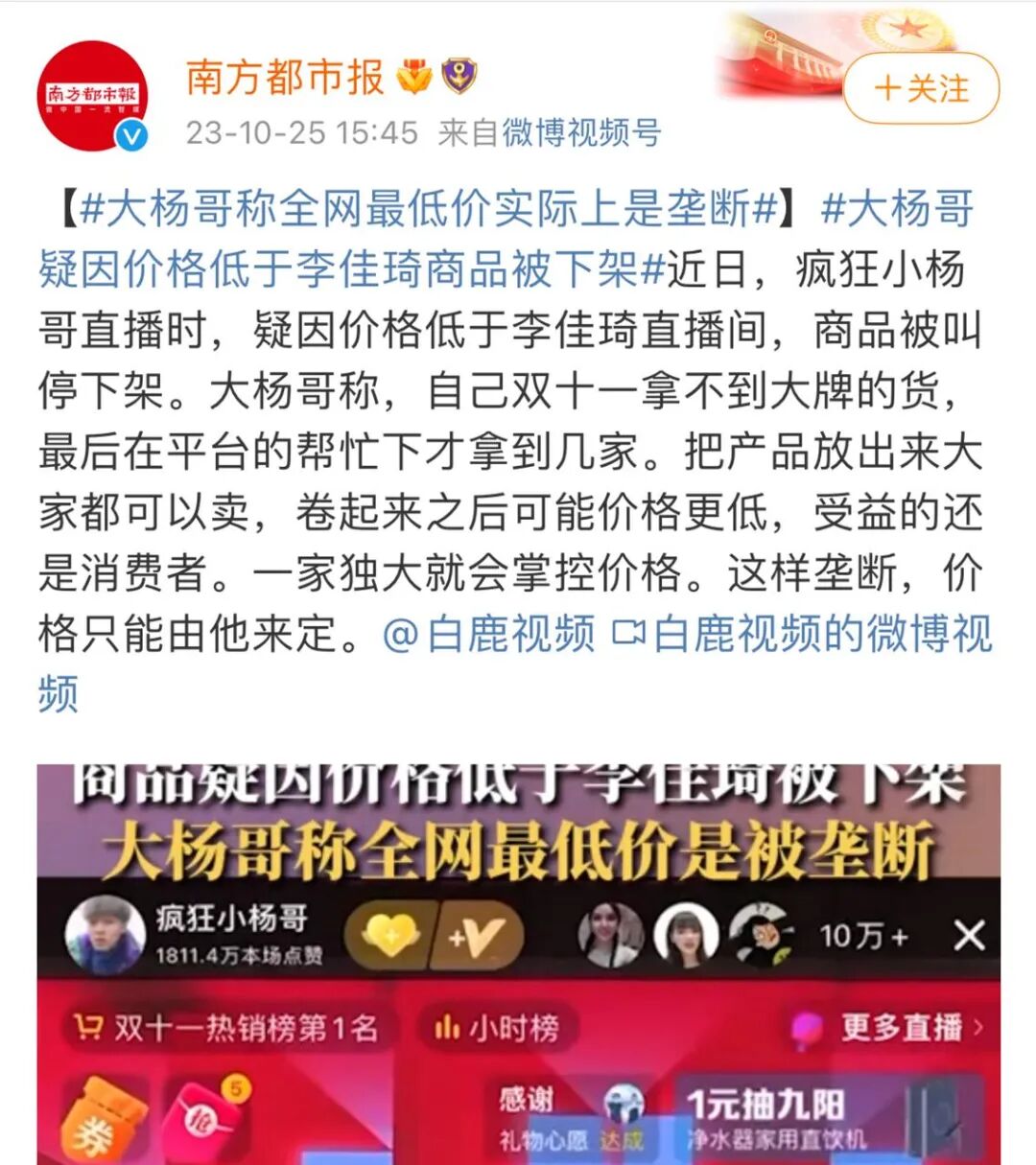 第2️⃣件事, 是头部主播小杨哥站出来,也大声抱怨李佳琦垄断,说大牌因为跟李佳琦签约合作了,自己如果补贴卖大牌,品牌就会下架商品,导致自己的直播间压根卖不了大牌。