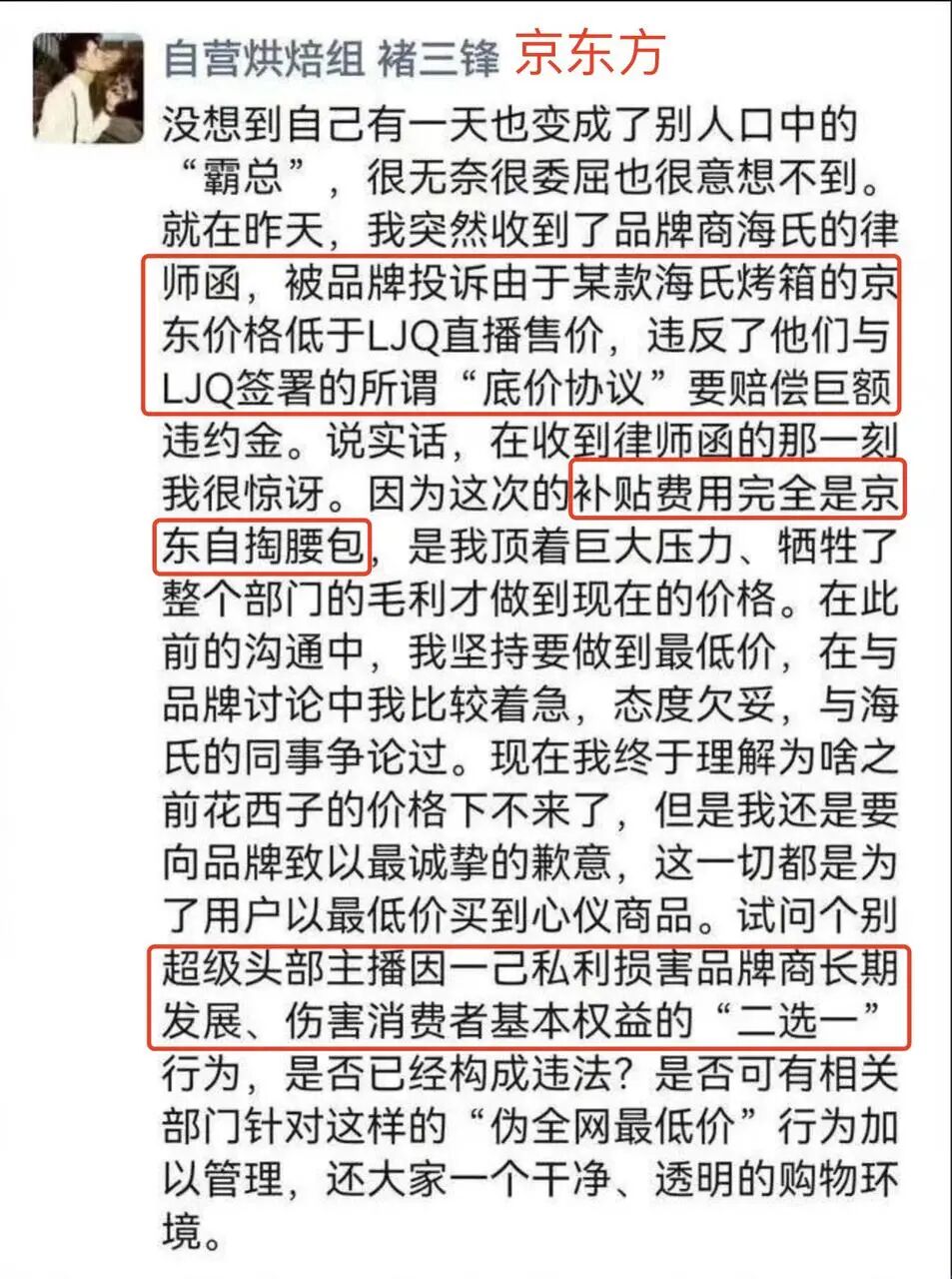 第1️⃣个事儿,有一个卖烤箱的叫海氏,说京东害他们要赔偿巨额违约金。京东方的人就站出来了,说我冤枉啊,你和李佳琦签的协议,干我屁事啊。