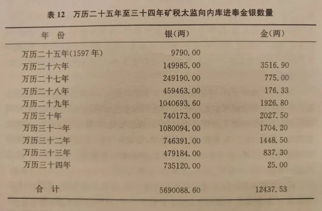 万历一共在矿税上收了多少钱呢?十年一共收了白银约569万两,金约12400两。这个数字其实不小,大约相当于国家财政一年的收入。