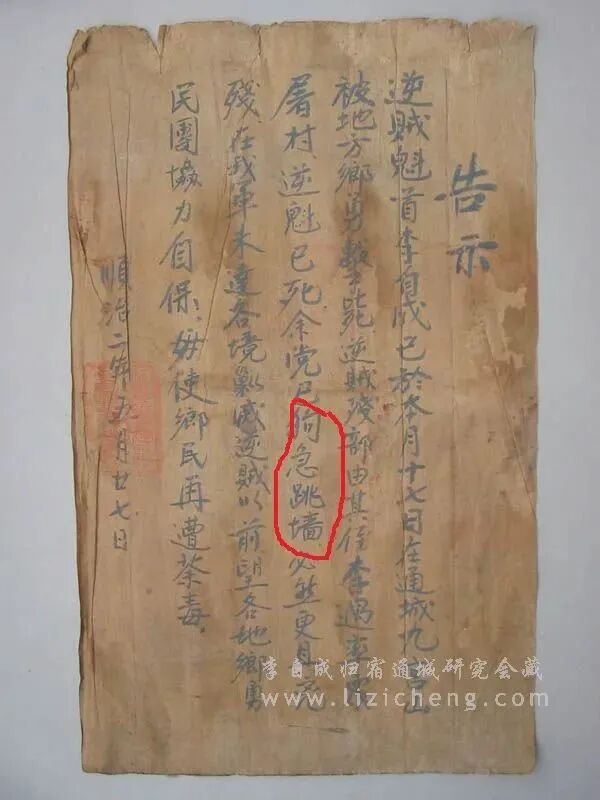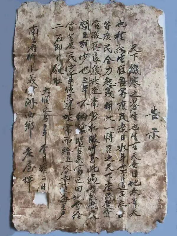 明史专家顾诚关于李岩其人是否存在,发表过多篇论文,引起了史学界的轰动,关于是否有李岩这个人,历史学家多有争议。但这件叫《永昌二年——李岩告示》的文物一出,所有争论可以停止了,顾诚老先生一败涂地。