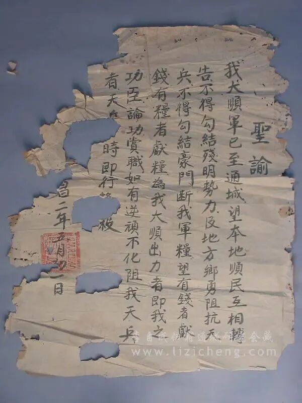 更为蹊跷的是,这张阿济格的告示竟然与下面这张李自成的《圣谕》的纸张相同,一个厂家生产的吧!