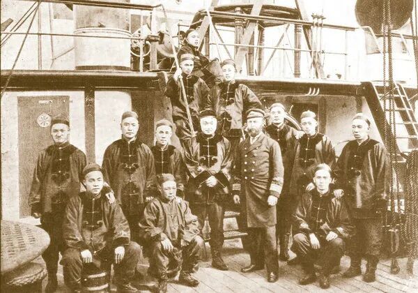 ▲中间束手者为邓世昌,邓世昌身旁中立者为琅威理