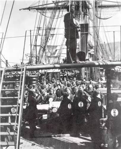 ▲致远舰管带邓世昌、北洋水师总教习琅威理,和官兵们合影