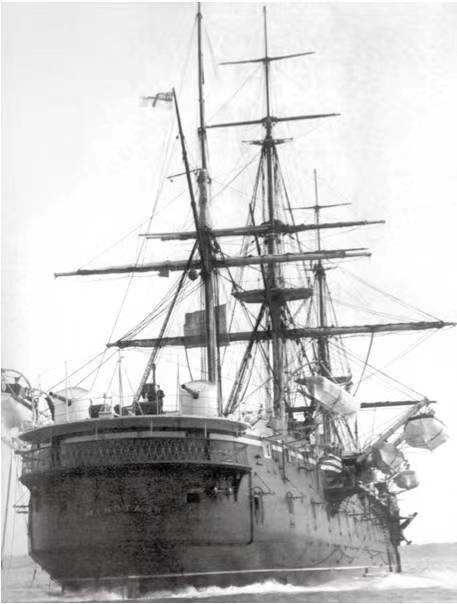 ▲英国海军“马那杜”号铁甲舰,刘步蟾在此舰艇上学习,任见习大副。其表现相当出色,后被李鸿章重用。