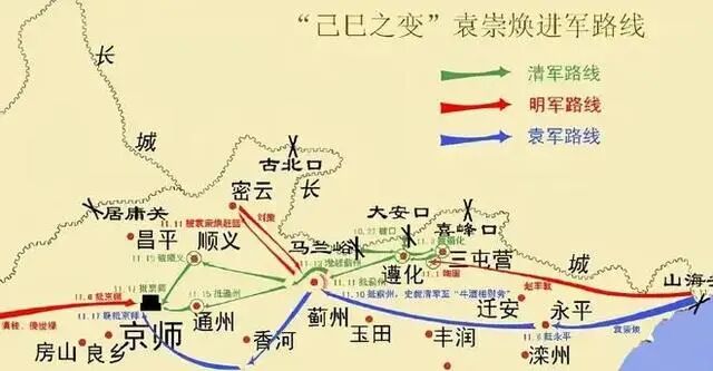 袁崇焕别无选择,他用弃车保帅的方式,让自己的主力从一条安全的路线,从山海关走永平到蓟州,对北边的城镇和清军,是看都不看,抢在后金军之前,到达蓟州设防。