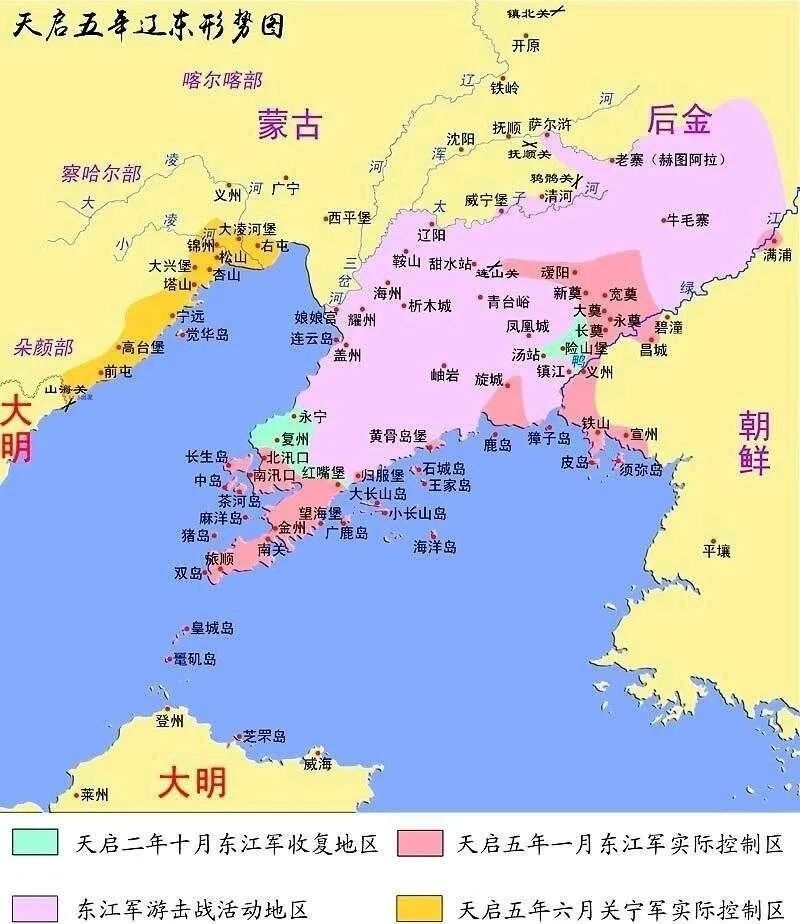 从1619年萨尔浒之战开始,努尔哈赤就一直在向明朝扩张。经过萨尔浒、沈阳、辽阳、广宁等多次战争,明军损失兵力在30万以上,钱粮数以百万计。明朝彻底地丢失辽西的大片土地,退守山海关外宁远、锦州一线。