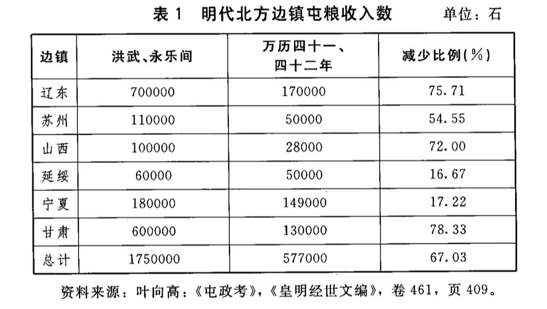 在洪武、永乐年间,辽东的军屯为70万石,到了万历末期,仅为17万石,大约减少了75%。故而首辅叶向高在向往里报告的时候说:现在的军屯比之嘉靖、隆庆年间减少了六七成。