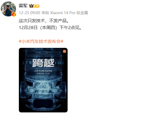 12月以来,车企友商们不断发布新产品,小米却不赶潮流,而是“只发技术,不发产品”。无论之前的预热,还是28日下午这场3小时的技术发布会,都不断将传达一个理念:小米汽车将“核心技术”与“汽车生态”进行了绑定。