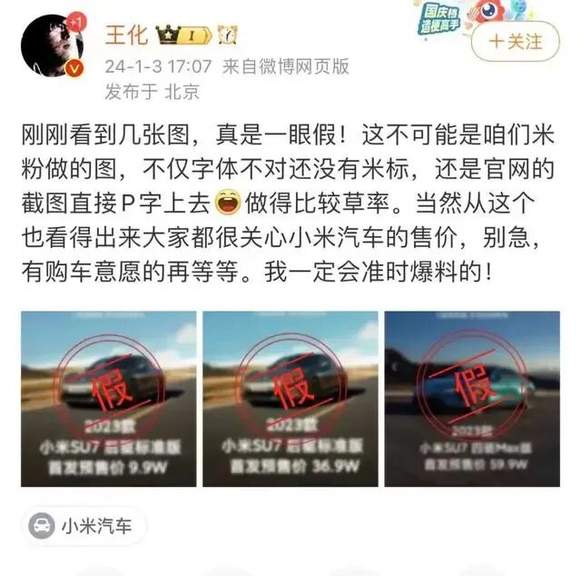 这两天,网上传出了几张小米汽车海报,文案爆料小米汽车不同档位售价分别为9.9万、36.9万、59.9万元,引发不少网友热议。随后,小米集团公关负责人王化随即辟谣。