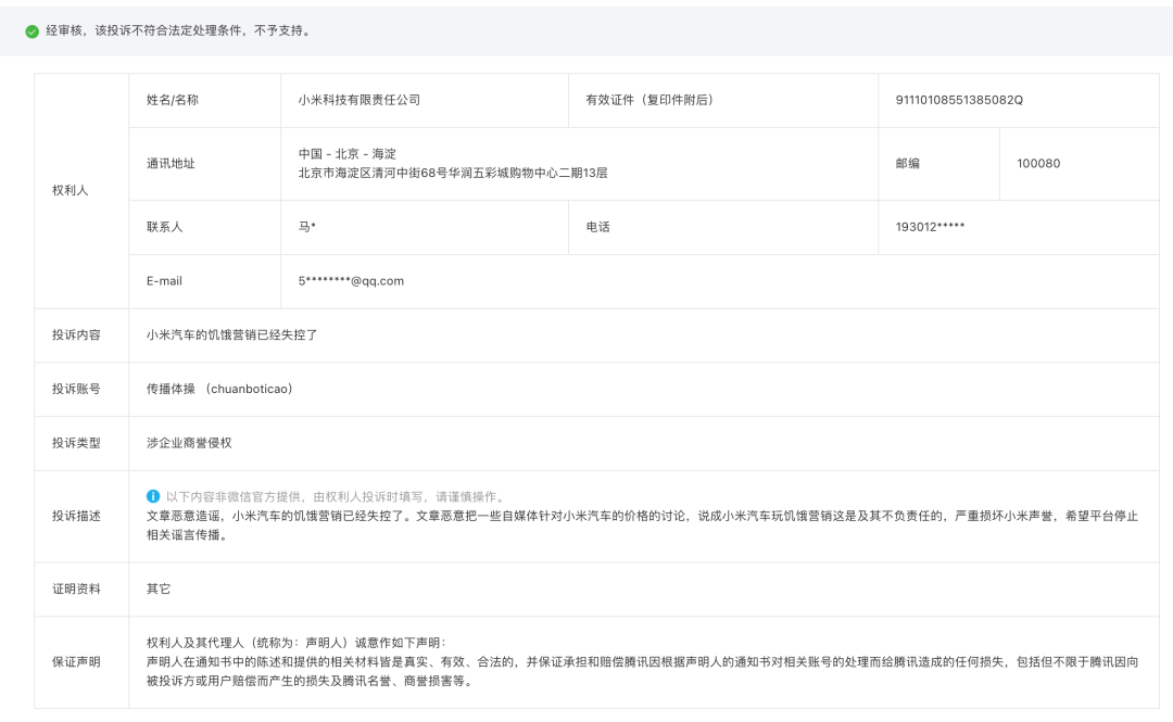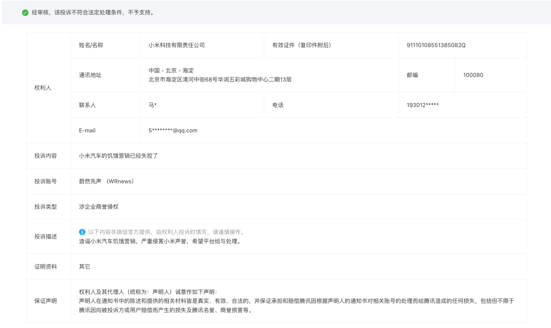 ·投诉描述一:“造谣小米汽车饥饿营销,严重侵害小米声誉,希望平台给与处理”(原文如此,“给与”作“给予”更加恰当)