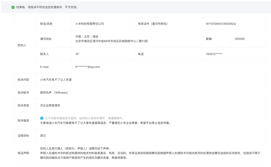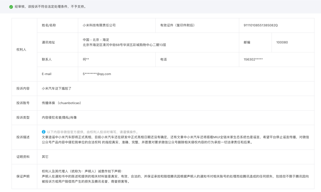 当然,小米公司所有认为我们涉嫌商誉侵权的投诉,最终均被微信官方判定为不成立。也就是说,公众号平台的专业内容侵权审核人员认为,我们的文章并没有侵权。