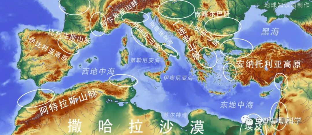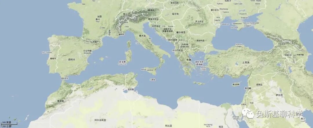 地中海东西长约4000公里,南北最宽处约1800公里,面积约251.2万平方公里,平均水深1450米,最深处为5121米。它是世界上最大的陆间海。地中海被亚欧非三块大陆包围,只在西面通过直布罗陀海峡和大西洋相连接。直布罗陀海峡也是非常狭窄的。它的最窄处只有14公里。因此,地中海是一个很封闭的海。它的海水盐度达到了39.5‰,高于海洋的平均盐度35‰。