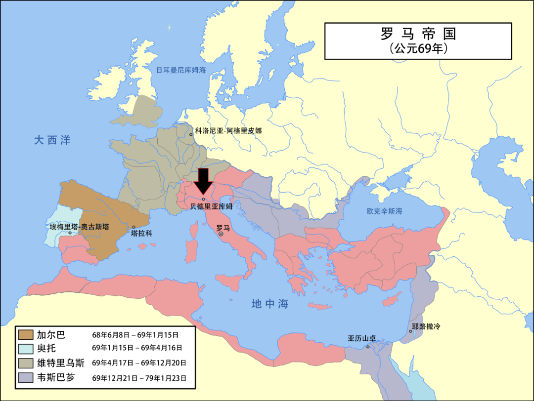 此后他连战连捷,于公元前69年12月进入罗马城,成为了这一年中的最后一位皇帝。