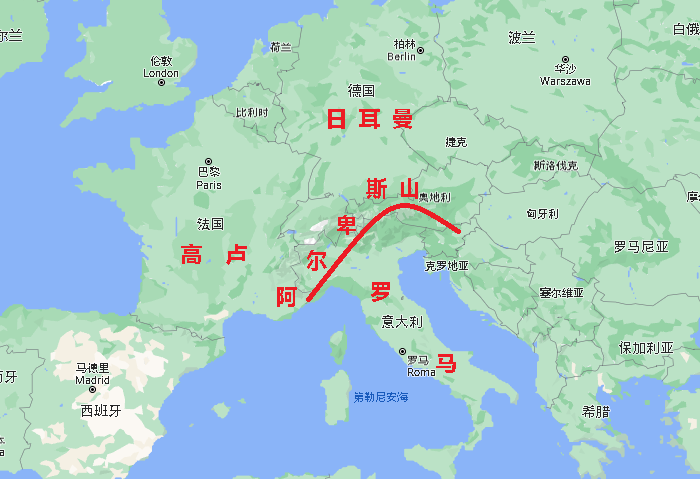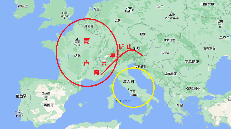 高卢是个古代地名,相当于今天的法国、比利时等地。这里虽然也与罗马隔着高耸的阿尔卑斯山,但沿着南部海岸还是可以绕到意大利半岛的。